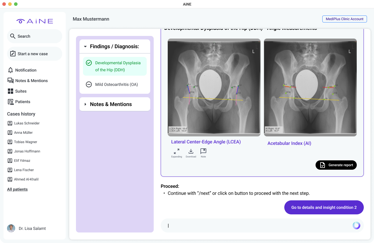 AI-assisted analysis supports measurements, calculations, and structured interpretation within an orthopedic context.